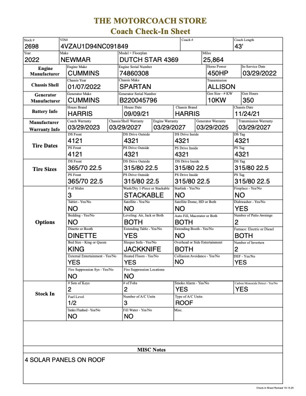 Please Click Here For Addition Specifications On This Coach